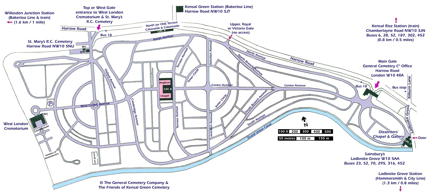 Kensal Green Cemetery is located in west London, on a 72-acre (29-hectare) site bounded on the north by Harrow Road, on the east by Ladbroke Grove, and the south by the Grand Union Canal.